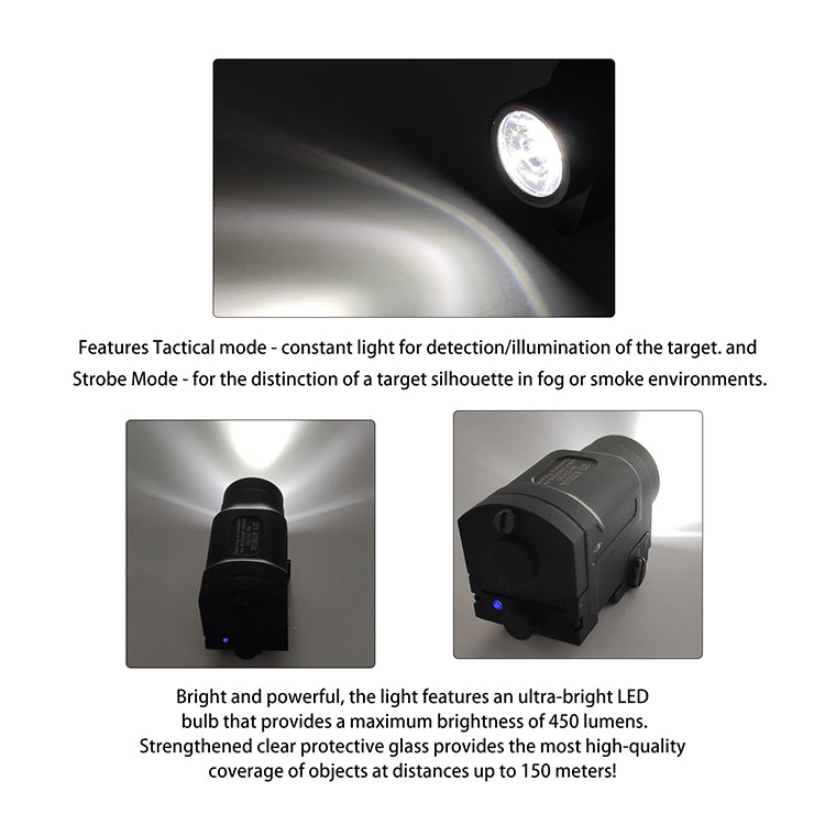 Features Tactical mode - constant light for detection/illumination of the target. and Strobe Mode - for the distinction of a target silhouette in fog or smoke environments. Bright and powerful, the light features an ultra-bright LED bulb that provides a maximum brightness of 450 lumens. Strengthened clear protective glass provides the most high-quality coverage of objects at distances up to 150 meters! The light is made from aircraft aluminum with a black anodized finish. Comes with a Tactical Remote Switch that allows you to turn the flashlight on & off with maximum convenience without changing the hand position. For user convenience, this AK SD Tactical Light utilizes Picatinny rail for installation and can be mounted directly to your barrel with B-9AK Rail Extender(included), and the included tactical remote switch can also be mounted to your rail. It's powered by two CR123A batteries.