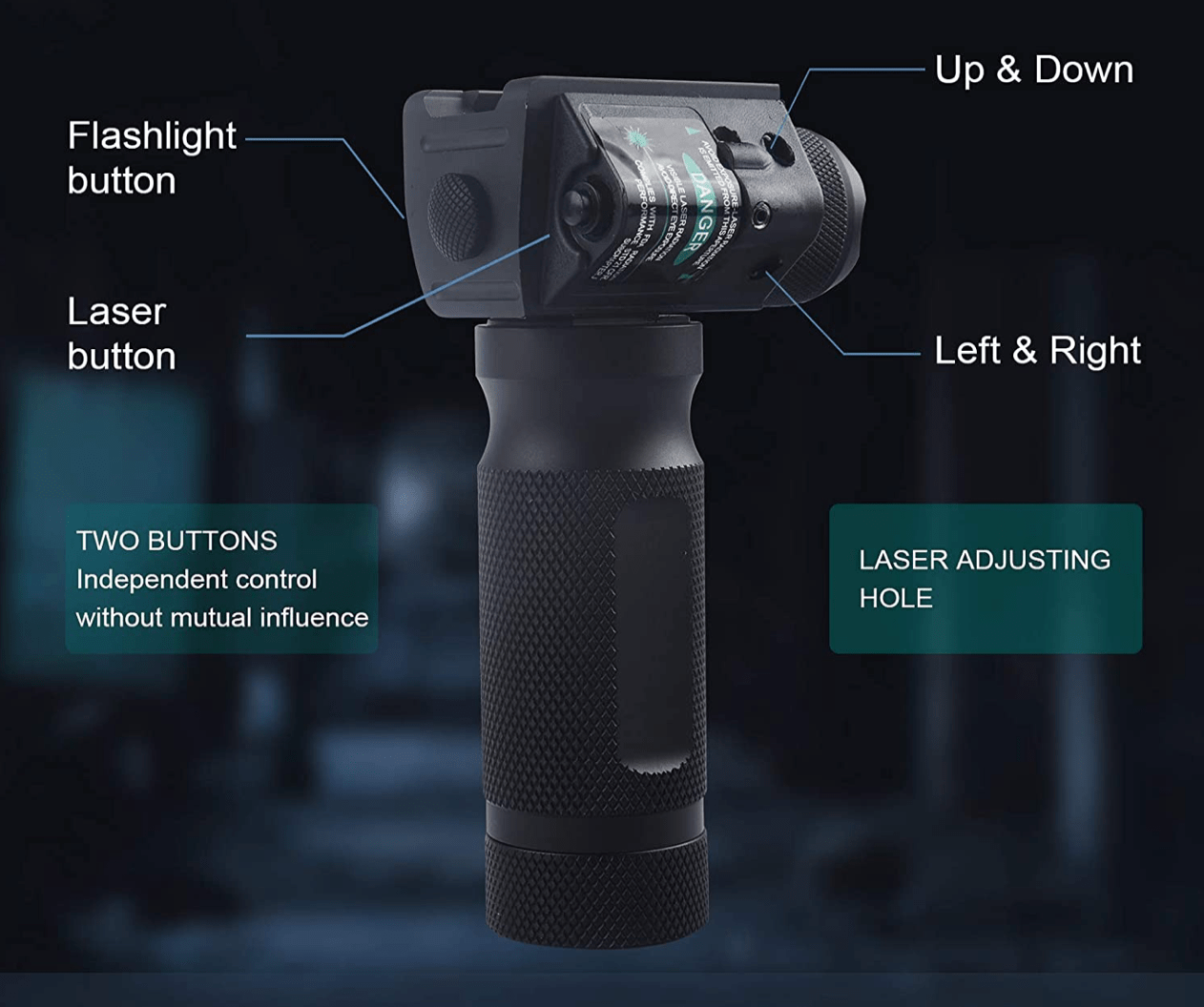 Designed for comfort and versatility, this all-metal grip includes a powerful CREE LED flashlight (available in 2000 or 220 lumens) with strobe mode and an adjustable “light” pointer (red or green, 650nm) for precision alignment. Its rubberized surface ensures a secure hold in any environment.