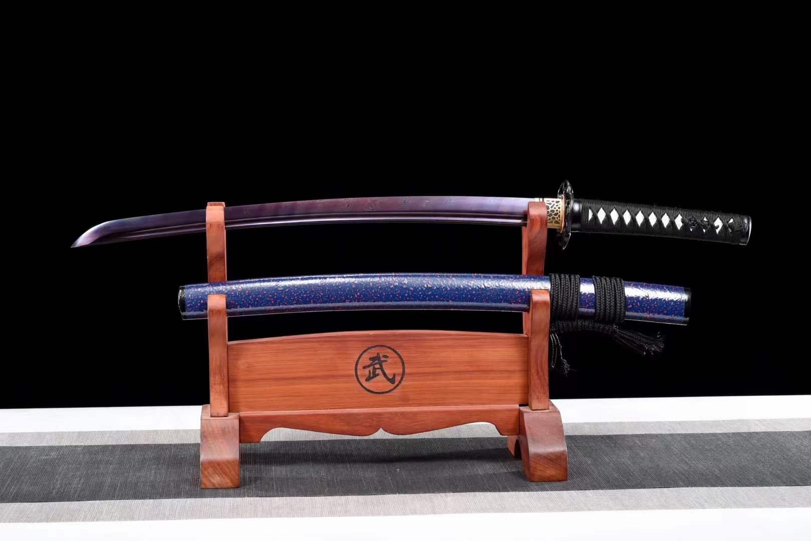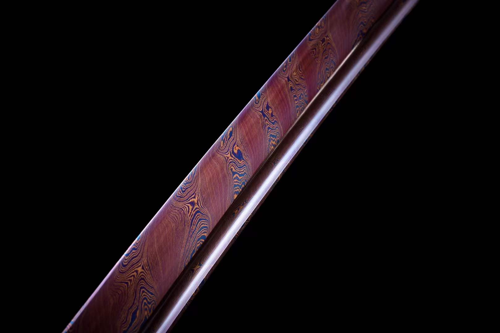 The blade is made of Damascus steel with baked blue twist pattern, with a hardness of 60°.