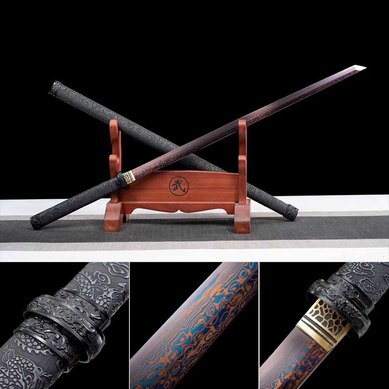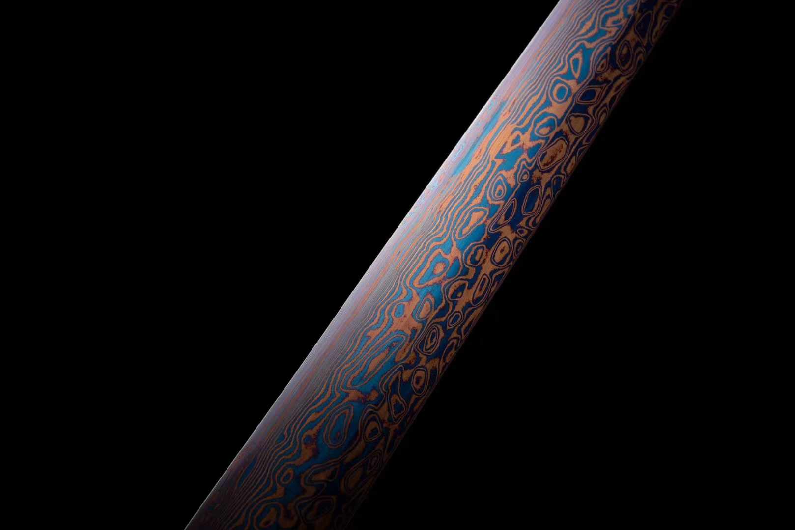 - This expertly crafted sword, named "Plunder", features a blade forged from Damascus steel and treated to an exceptional 60 HRC hardness. The blued finish and intricate flower pattern give the blade a stunning visual appeal.