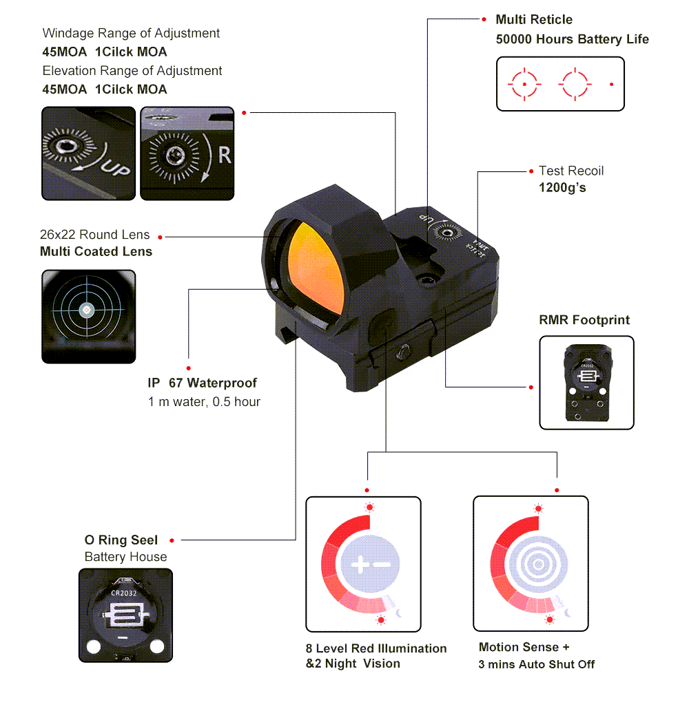 Meet the versatile powerhouse that is the Regulator MRS! This red dot not only has the original's parallax-free design, 50,000 hour runtime, Motion-Sensing Technology, but it adds multi-reticle functionality with a 3moa center dot. Worried about rain? Don’t be! The Regulator is IP67 waterproof. Will it hold up to (insert caliber)? Hell yeah it will! Rated up to 1200g’s, this little guy will eat .338 Lapua recoil for breakfast and comes with a lifetime warranty! Place it on your pistol, shotgun, or rifle and never worry about recoil issues. Add unparalleled precision and night vision adaptability to your firearms with the Regulator MRS, and choose the reticle that best fits your style. Enjoy a customized shooting experience, and get yours today!