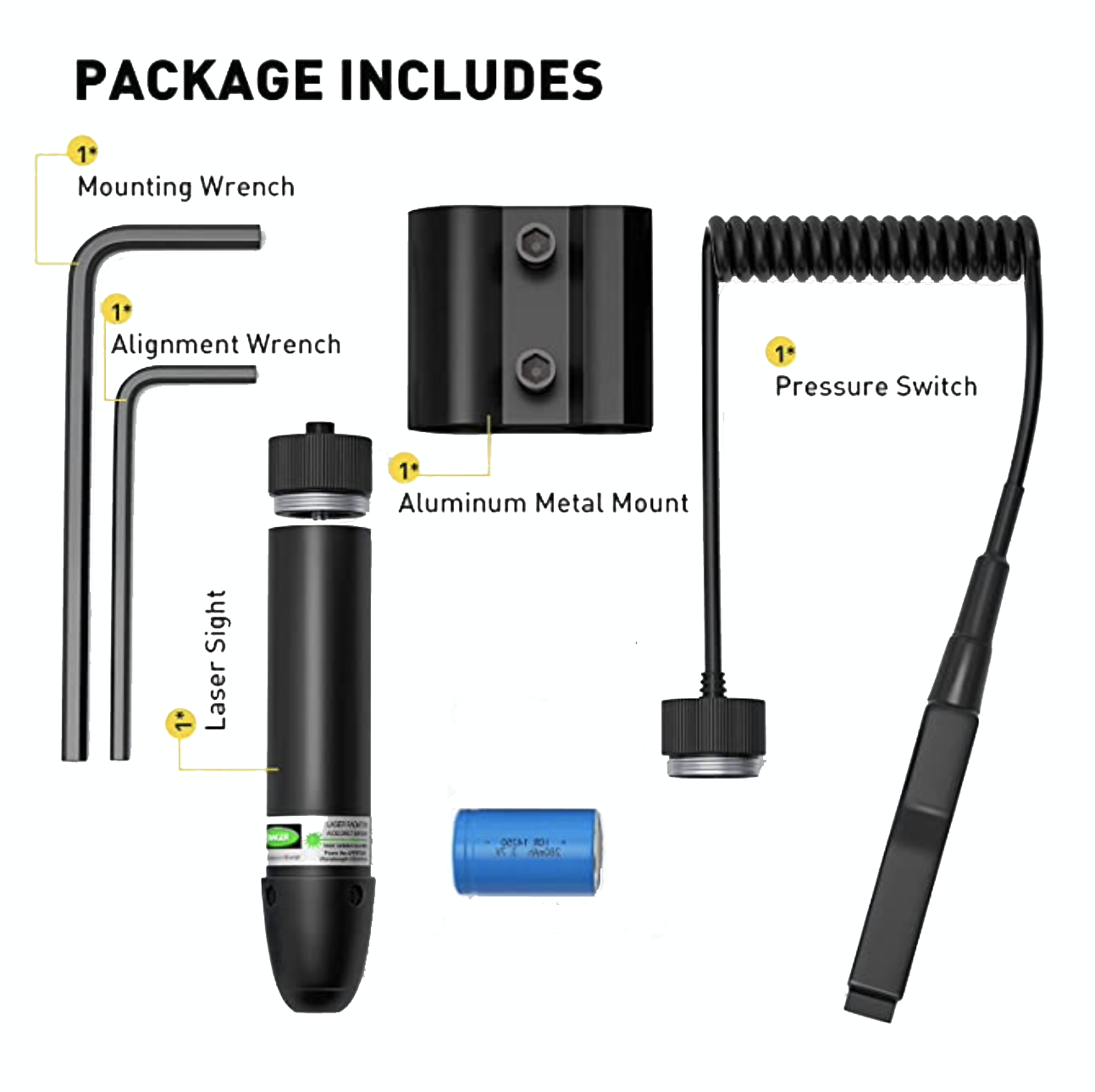 - 1 x Green or Red Dot Laser Sight (specific to your order)