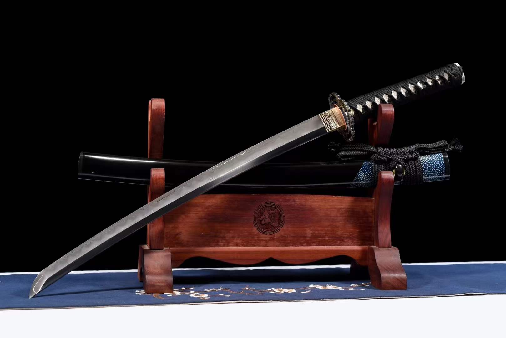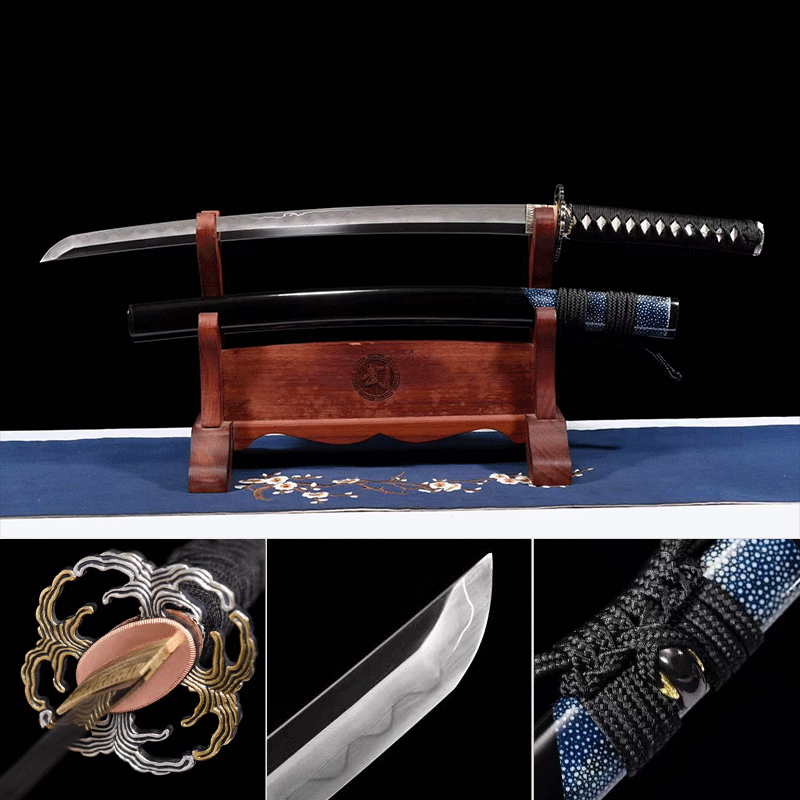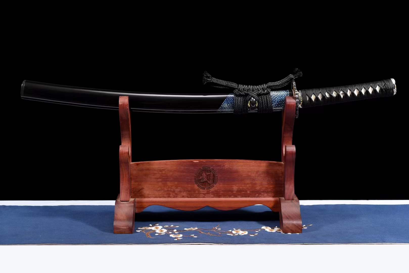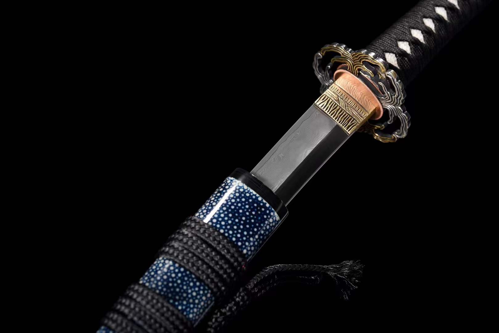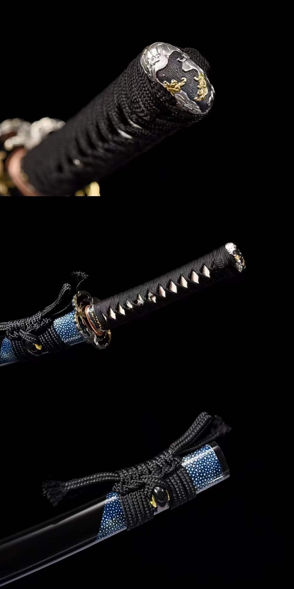 | Saya Material: | Half-wrapped blue fishskin sheath made of lapis lazuli wood (carp mouth, stopper, and chestnut rows are inlaid with cow horns) |