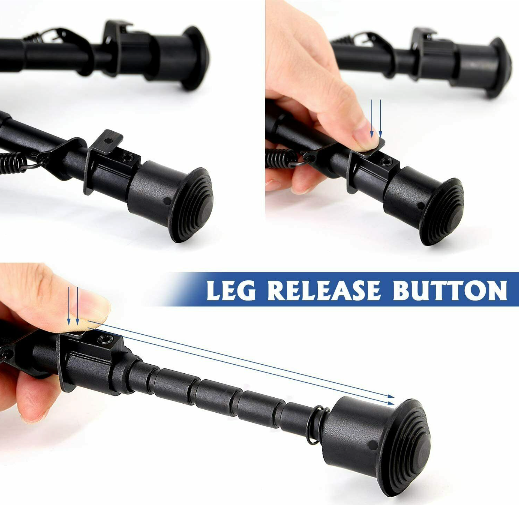 The integrated sling ring attachment allows you to mount the bipod and still use a sling. The 6-9" adjustable legs extend at the push of a button and spring up for easy transport.